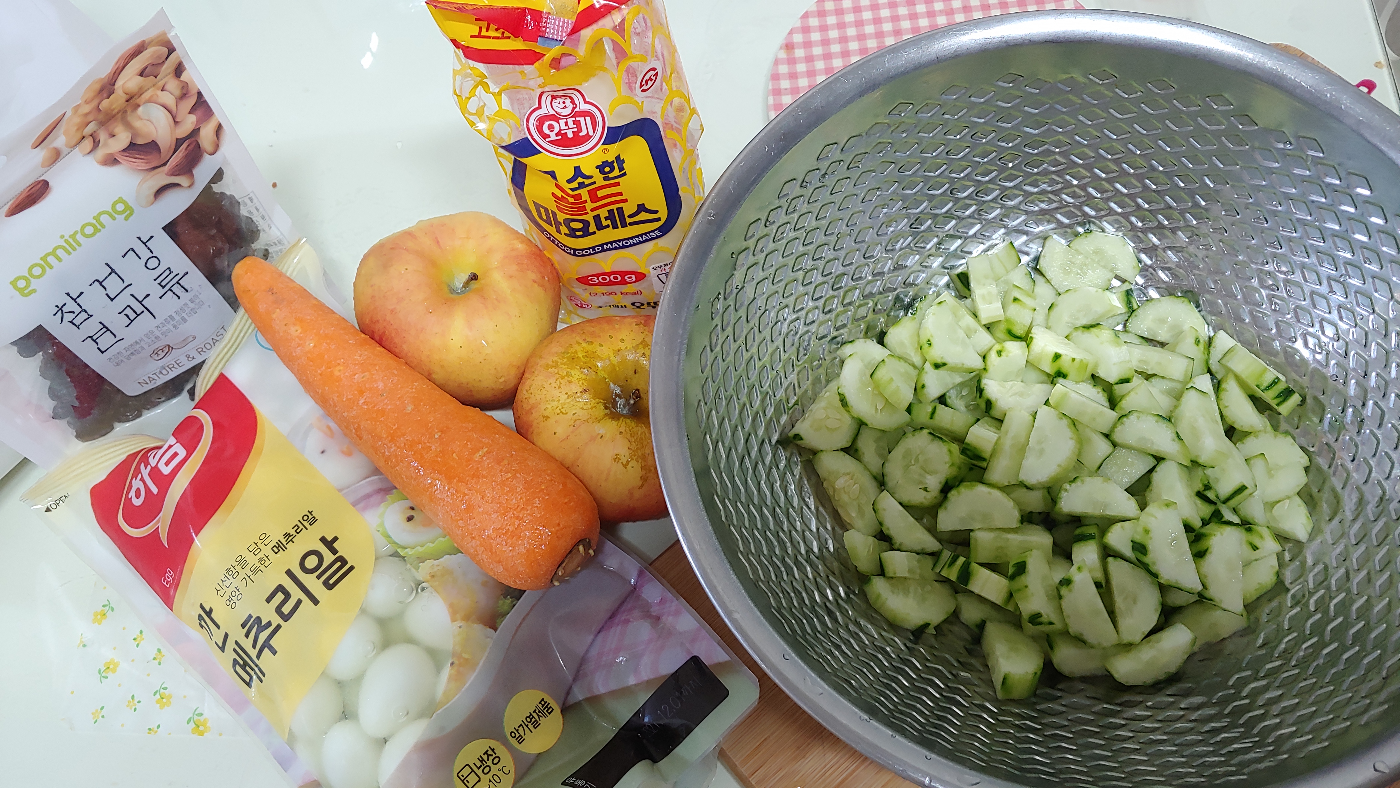 깐 메추리알, 당근, 사과, 마요네즈, 견과류, 오이, 감자. 맛소금